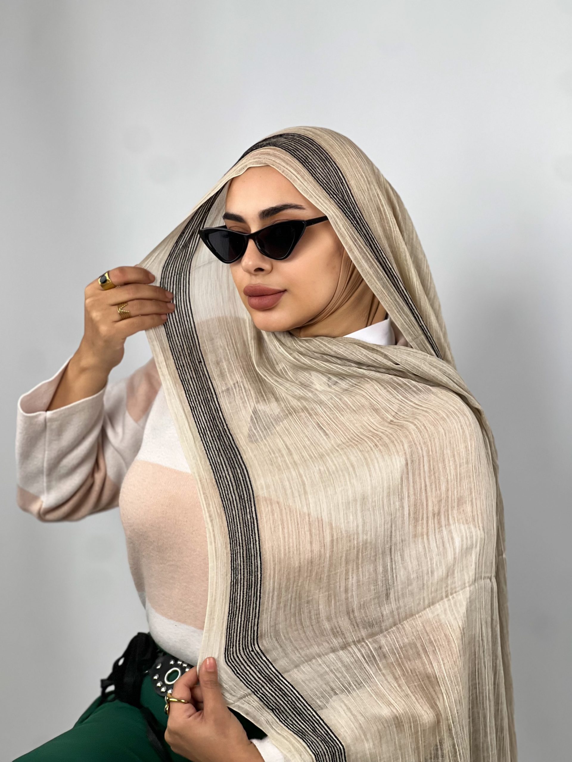 Raveld scarf with two black edge lines, featuring a clean and elegant design. Lightweight, comfortable, and practical for everyday wear.