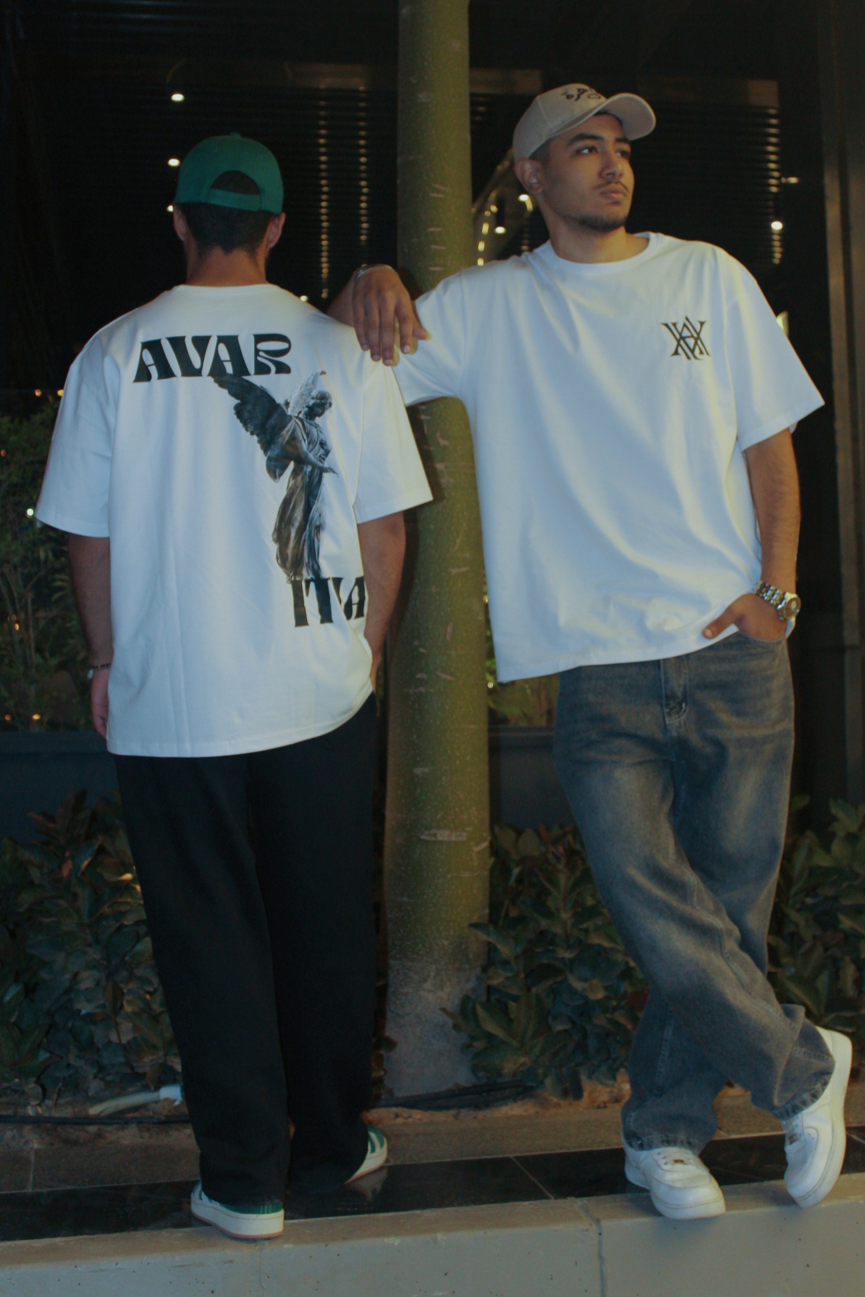 White oversized T-shirt featuring a powerful angel statue graphic on the back. Designed to stand out with bold, elevated simplicity.