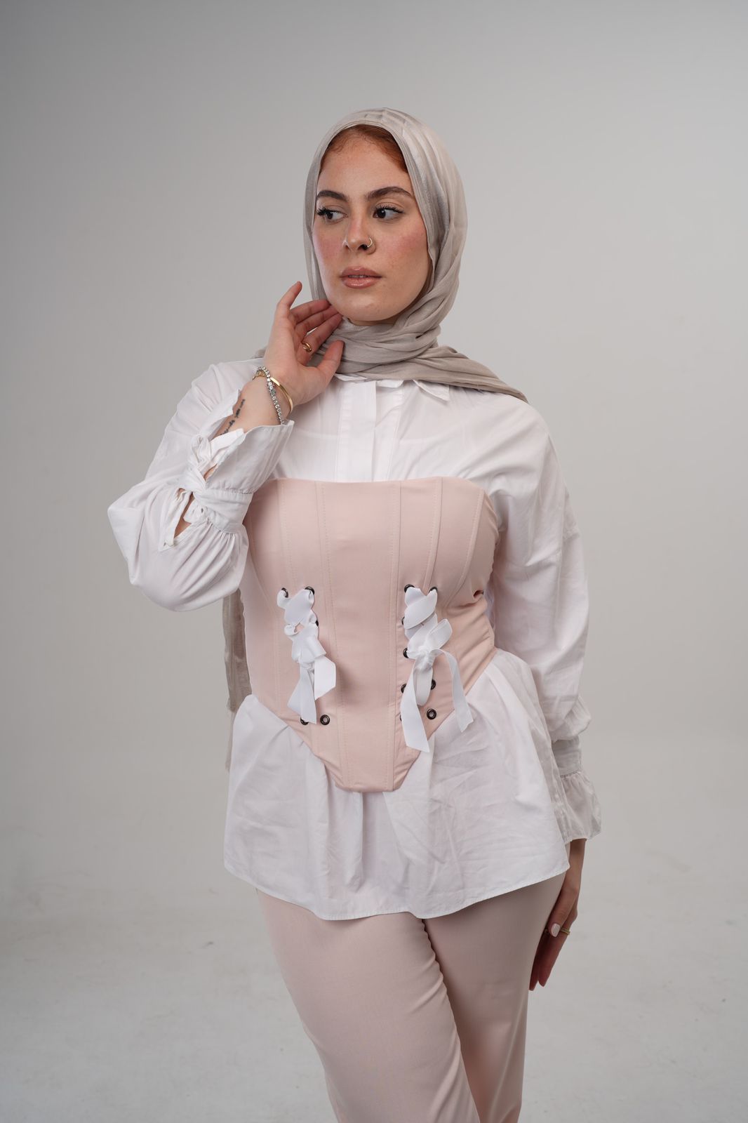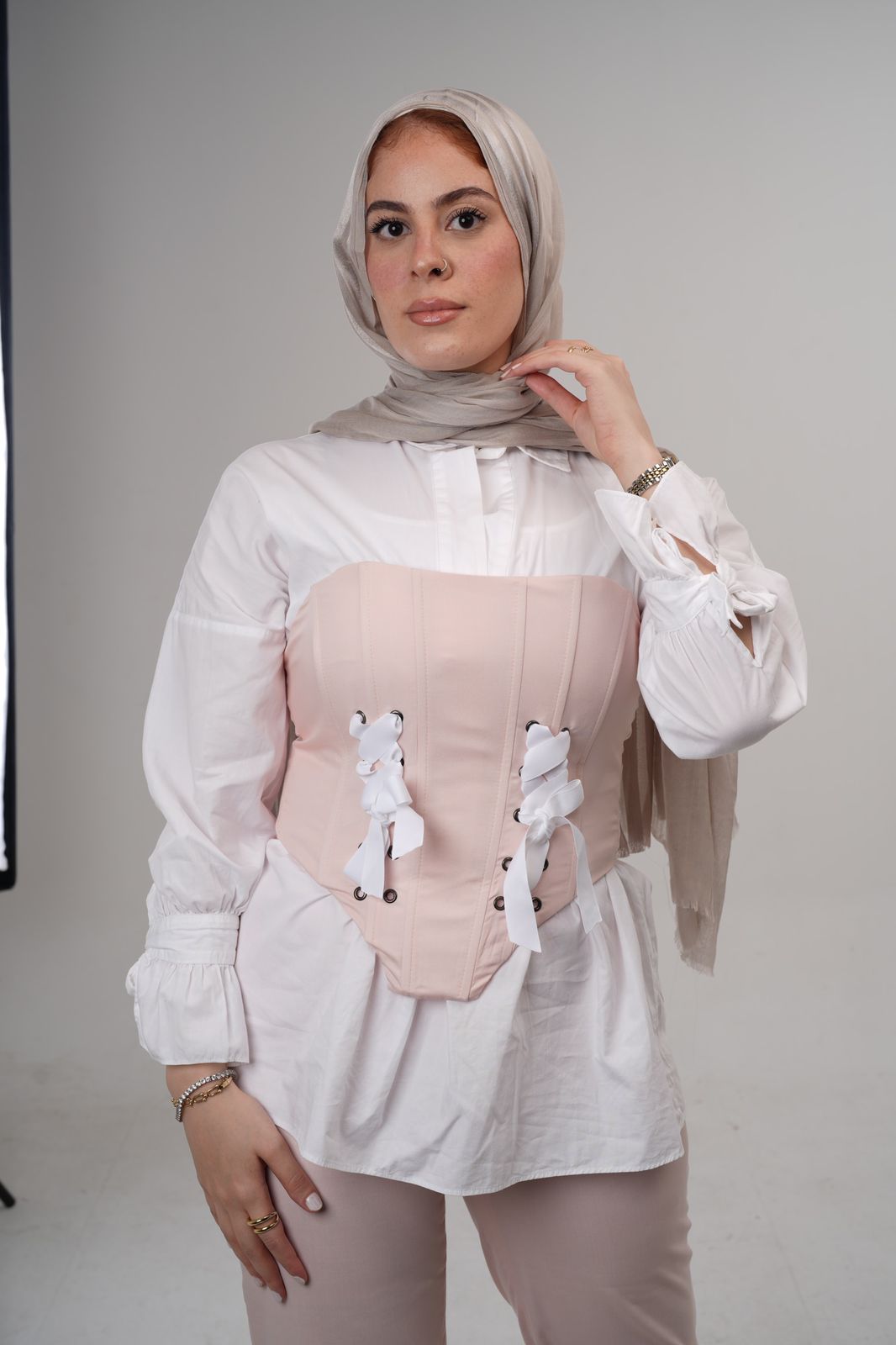 Chic baby pink corset with soft white ribbons – a feminine touch for a standout look.