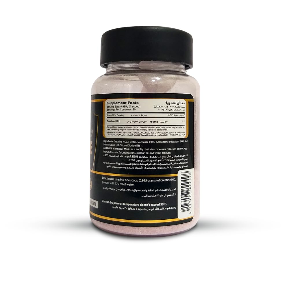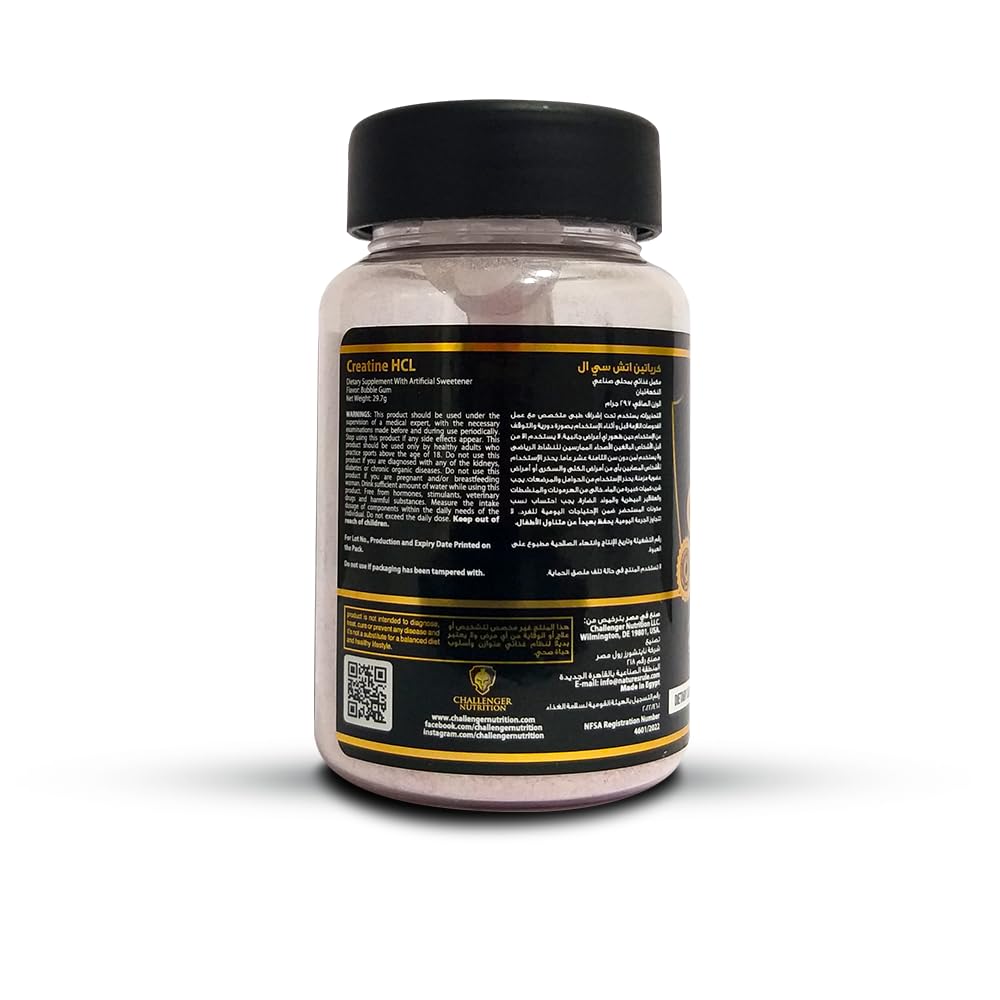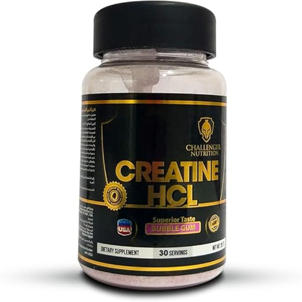 Unlock advanced performance with Challenger Nutrition Creatine HCL in delicious Bubble Gum flavor. This ultra-soluble formula is designed to enhance strength, power, and endurance while promoting rapid muscle recovery without causing water retention or bloating. Each serving provides 750mg of premium Creatine HCL. Perfect for athletes seeking explosive power and fast absorption, delivered with a fun taste