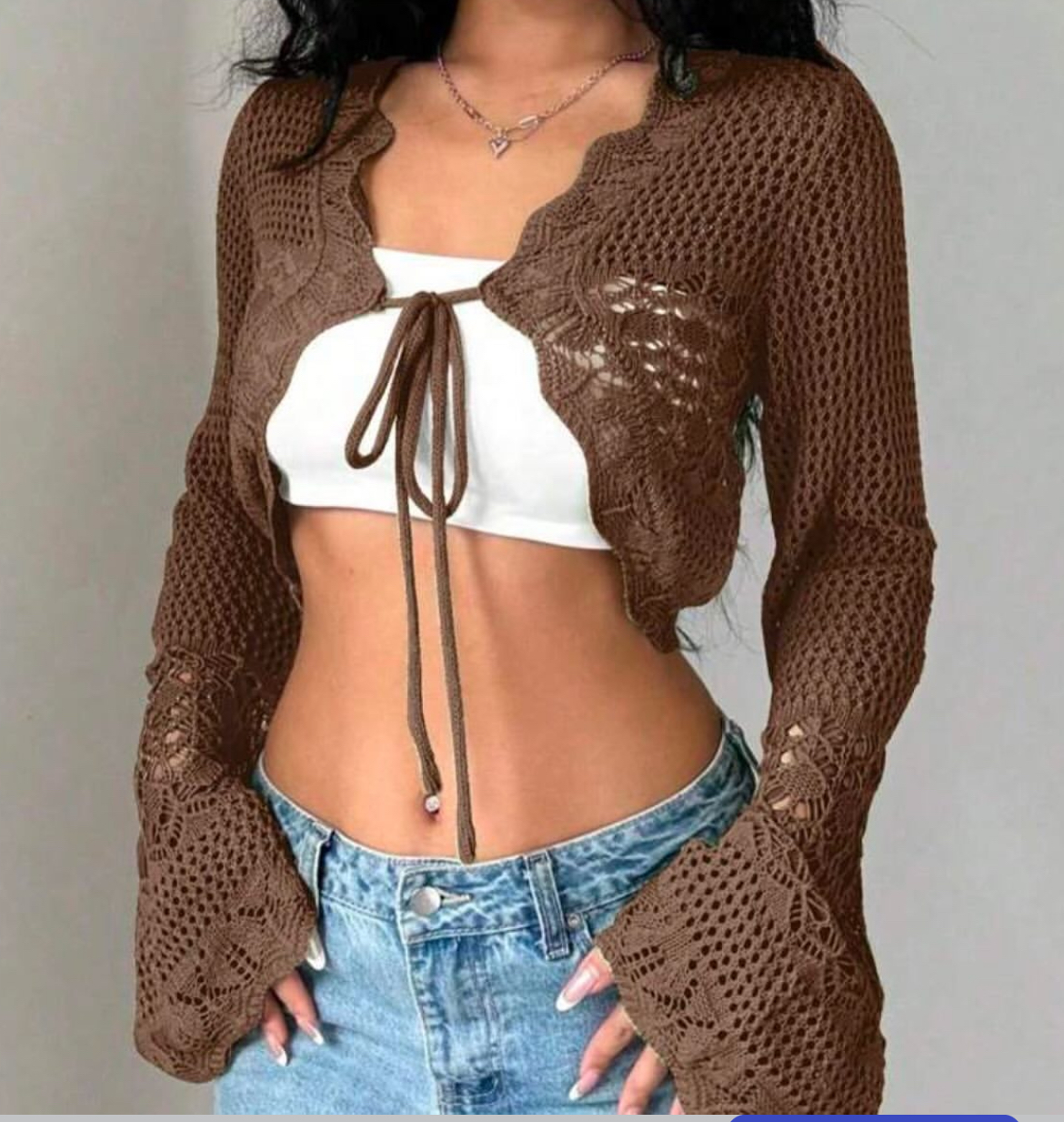 Boho-chic crochet shrug with flared sleeves and tie-front detail — your perfect lightweight layer for warm days.