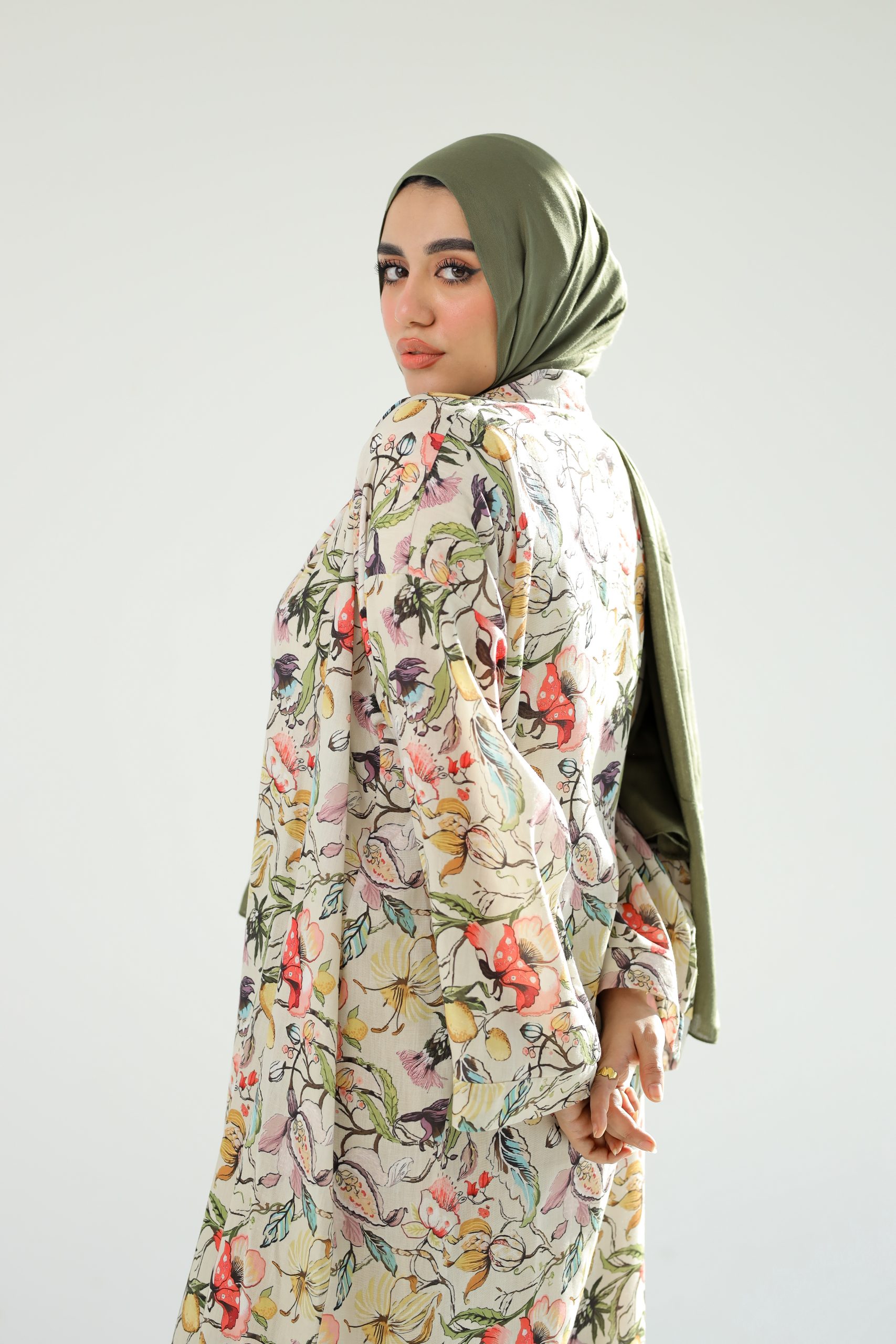 Designed with a soft pastel base and vibrant blooms, it drapes beautifully over any look — whether you’re dressing up or keeping it casual. The flowy cut and full-length sleeves make it perfect for layering all year round.